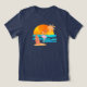 Este ilustracion tropical y divertido rebosa de vibrantes vibrantes vibraciones vacacionales. Un elegante flamingo rosa se encuentra sobre un parche de arena al lado de una tabla de surf, frente a una vívida puesta de sol con cielos naranjas y pinceles oceánicos azules. A lo lejos, las palmeras se desprenden suavemente, añadiendo un ambiente de playa.