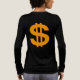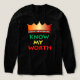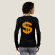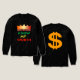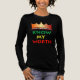 Camiseta femenina con las palabras "Conoce mi valor" en colores africanos, con una corona dorada en la parte superior. La parte trasera tiene un signo de dólar dorado.