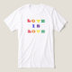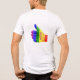 Camiseta con texto en colores arcoiris. Por otro lado está el símbolo de la comunidad LGBT