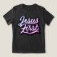 ¡Qué recordatorio para el que lleva la camisa y para los que la leen—Jesús siempre debe ser primero y principal en la vida de un cristiano! El diseño en sí estará disponible en unos cuantos colores diferentes para elegir. Esta camisa viene en una variedad de estilos, tamaños y colores para hombres, mujeres y jóvenes. La impresión intensa es mejor para este diseño y la elección de los colores en los que aparece.
