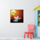 Un fantasma de Halloween yendo por Truco o Tratando con un balde de calabaza en la mano. Bates voladores, luna, árboles secos y hojas al fondo.