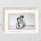 Sutil y elegante, nuestra tarjeta de vacaciones chic enmarca tu foto favorita con pinceladas de acuarela en un greige neutro y transparente, con "Feliz Navidad" en la parte superior en letra delicada de bloque y cursiva. Personaliza con el nombre de tu familia y el año en la parte inferior. Un patrón trasero de pequeños pinos en blanco sobre colores coincidentes añade un atractivo festivo.