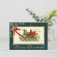 Trineo de Navidad vintage, muérdago y copos de nieve sobre fondo verde hacen de esta una perfecta tarjeta de Navidad o tarjeta de saludo para amigos y familiares.