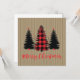 El diseño rústico de una casa de campo presenta un trío de siluetas de árboles de estilo Evergreen, una de chapa de búfalo rojo y negro, texto de "Feliz Navidad" en rojo festivo y un fondo de rayas vintage silencioso