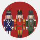 Trio de petardos de petardos navidades: tres petardos de nueces de pie uno al lado del otro sobre un sólido fondo rojo. El primer petardo está vestido de azul y blanco con adornos dorados. El petardo central está vestido de rojo y oro con adornos dorados. El tercer petardo está vestido de verde y blanco con adornos plateados. Cada una de estas galletas nudistas está disponible por separado en diversos regalos y productos de Zazzle.