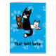 Una plantilla adaptable de la tarjeta de felicitaciones que ofrece tres gatos del dibujo animado. Un tabby, un negro y un blanco en un fondo azul vibrante con pawprints azules más ligeros.