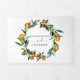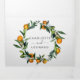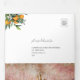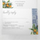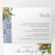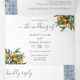 Una elegante invitación de 3 en 1 a 3 bodas triplias con decoración de naranjas y vegetación, y azulejos azules. Incluye detalles (alojamiento e información) y la tarjeta postal rsvp para que tus invitados corten y envíen de vuelta.