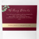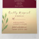 Esta elegante invitación a una boda triplemente repartida presenta un rico degradado de color burdeos y dorado, con frondosos acentos botánicos y un romántico detalle cardíaco. El diseño todo en uno incluye espacio para detalles bodas, RSVP y selecciones de comidas de invitados, lo que lo convierte en una práctica pero hermosa elección con conciencia ecológica. Nota: Esta triple invitación requiere un sobre separado para el envío por correo. Recomendamos utilizar un sobre A9 estándar (5,75" x 8,75") para el mejor ajuste.
