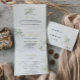 Esta invitación a una boda triplia de follaje verde dorado es perfecta para un boda rústico. Este diseño artístico presenta acuarelas de color oro y follaje verde de inspiración natural.