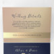 Sencilla, elegante y minimalista invitación de boda de tres solapas en rosa oro y azul marino, con hermosa cuerda de corazón de pan de oro y foto de la pareja.