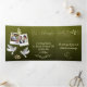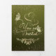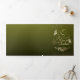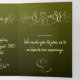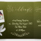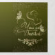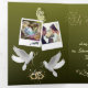 tarjeta personalizada con textura verde degradado y mariposas doradas con corazones y purina en los dos laterales en la parte exterior y palomas blancas con dos anillos con fotos de novios en la parte interior.