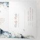 Esta invitación de tres pliegues presenta un trazo de brocha acuática en tonos azul marino con acentos dorados que imitan las olas en la playa, lo que la convierte en una elección perfecta para una boda de verano o de playa. Es minimalista y elegante en diseño y elección de tipos de letra, también muy fácil de personalizar. Otros artículos de esta colección lo complementan muy bien, así que revisa toda la colección "Watercolor Waves" en nuestra tienda.