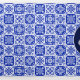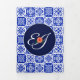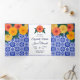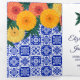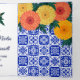 invitaciones mexicanas y españolas con azulejos azules tradicionales en el fondo y marigolas amarillas y naranjas brillantes.