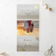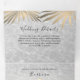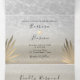 Sencilla, moderna, tropical, invitación tripartita de boda en la playa de 3 en 1, con hojas de palma doradas, arena y olas del océano y foto de la pareja.