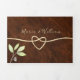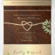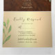Elegante, moderna, invitación triple de boda de madera rústica con vegetación en acuarela, corazón de cuerda dorada simple y foto personalizada de la pareja en la parte posterior.