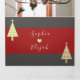Celebre una boda invernal festiva con esta moderna invitación tripartita que presenta tonos rojos intensos, negros y marfil con acentos caprichosos de árboles de Navidad. Un diseño de caligrafía romántica incluye espacio dedicado para los detalles de la ceremonia, RSVP y notas personalizadas, lo que lo convierte en un diseño ecológico y elegante todo en uno. Tenga en cuenta: esta invitación requiere un sobre separado para enviarla por correo. Recomendamos usar un sobre estándar A9 (5,75" x 8,75").