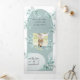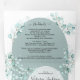 Hojas y ramas de eucalipto luminosas y etéreas con arco moderno. Invitaciones triples plegables todo en uno que incluyen tarjetas de respuesta RSVP, detalles e información y una foto de la pareja. ¡Maravilloso para una boda con tema de naturaleza! Colores de esquema de azul polvoriento, verde y blanco.