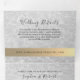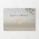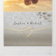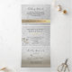 Sencilla, elegante, moderna, invitación triple plegable para boda de verano en la playa 3 en 1, con hermoso corazón de cuerda dorada, arena y olas del mar y foto de la pareja.