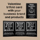 ¡Feliz Día de San Valentín! Una festividad encantadora para celebrar este mes de febrero y para anunciar también su negocio o promocionar su marca. Tarjeta triple de personalizable negro con saludo de San Valentín, su nombre de negocio, productos o servicios y otra información de su negocio. Tarjeta triple como folleto para su negocio. Puedes poner hasta tres productos o servicios. Personalizar y dáselo a sus clientes o clientes para que les saluden esta fiesta de San Valentín y como material de marketing para promocionar su negocio y promocionar sus productos o servicios. Para personalizar de esta tarjeta triple, cargue el logotipo de su empresa y las imágenes de sus productos o servicios. Escriba también su nombre comercial, dirección, número de teléfono, correo electrónico, sitio web o su página de red social comercial y una breve y atractiva descripción de sus productos o servicios. Por favor, compruebe la apariencia en todos los lados después de subir imágenes y teclear textos. Si la apariencia le resulta agradable, puede realizar su pedido ahora. Si necesita cambiar el tamaño y mover las imágenes y los textos para que encajen en esta tarjeta triple, por favor cambie la herramienta de diseño. También puede cambiar el color de fondo, el color de fuente y el estilo de fuente en la herramienta de diseño. Anuncie su negocio. Promociona tu marca. tarjeta triple de personalizable que se puede utilizar para crear conciencia de marca. ¡Feliz Día de San Valentín! Te deseo más ventas esta temporada de vacaciones.