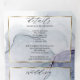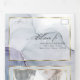 Salpicadura etérea de manchas de tinta de alcohol en tonos de azul marino, verde azulado y rico púrpura amatista, cada sección resaltada con un marco dorado blanco transparente superpuesto, en el centro delantero está su foto acentuada con un doble marco dorado y detrás del marco blanco transparente para un atractivo esotérico, un hermoso diseño abstracto moderno para una invitación de boda todo en uno, completa con una tarjeta de respuesta desmontable pre-direccionada para la elección de comida para que sus invitados puedan enviarla fácilmente por correo: una impresionante invitación de boda todo en uno.