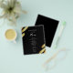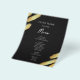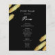 Menú abstracto negro y dorado. Hoja de oro falsa. La fuente script destaca con una fuente de nombre serif fácil de leer. Fácil de ajustar para las necesidades de su boda. Haga su propio menú, use su propio texto para crear un menú de evento elegante pero barato y asequible. Fácil de personalizar. Hojas de papel de menú personalizadas.
