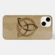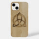 Un Funda del iPhone 14 con un triquetra celta de color sencillo, entrelazado con un círculo que forma un símbolo trinitario contra un fondo de madera, representando la unidad espiritual con lo divino.