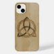 Un Funda para iPhone 14 Plus con un triquetra celta de color sencillo, entrelazado con un círculo que forma un símbolo trinitario sobre un fondo maderero, representando la unidad espiritual con lo divino.