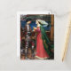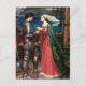 Postal de John William Waterhouse Tristan y Isolde. Pintura de óleo sobre lienzo de 1916. El pintor inglés John Waterhouse recurrió regularmente a temas literarios. Tristan and Isolde es una de sus últimas pinturas y muestra al artista utilizando colores brillantes y contornos duros. La princesa irlandesa Isolde se para en la cubierta de un barco sosteniendo una poción en un vestido rojo con barniz de piel. La chica también usa un chal verde con bordado de oro mientras su velo sopla en el viento. El héroe Tristan se pone de pie en plena armadura mientras toma el cáliz dorado del chica. Ambos personajes están en un barco en el mar, y se puede ver un pequeño castillo en el fondo. Un gran regalo para los fanáticos del J.W Waterhouse, los pre-raphaelites, la pintura romántica inglesa y el mito del norte.