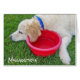 goldendoodle sobre la hierba por el tazón de agua roja por extrañarte