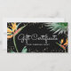 Permita que sus clientes entreguen sus servicios a sus amigos con estos elegantes, sofisticados, sencillos y modernos certificados de regalo. Sorprendentes aves acuarelas tropicales, coloridas y dramáticas, con flores del paraíso, purpurina de oro falso y escritura caligráfica personalizada blanca, superponen un elegante, dramático y negro fondo. En la parte posterior, hay amplio espacio para que el remitente escriba los nombres "To" y "From", la cantidad y la fecha de caducidad en el área del rectángulo blanco rodeada por un falso purpurina de oro salpicado por un polvoriento borde rosa rosa. Personaliza con tu nombre de negocio e información. Disponible con sobres blancos. Hace una declaración moda, profesional y elegante dondequiera que vayas. También están disponibles tarjetas de visita y otros productos que coincidan: https://www.zazzle.com/tropical_floral_script_gold_on_black_beauty_salon_business_card-256696260630306995 Simplemente escriba su nombre de negocio y la información de contacto en la sección "Personalizar esta plantilla", y podrá personalizar fácilmente este certificado de regalo. Por favor, envíame cualquier pregunta o petición.
