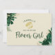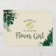 Tarjetas de propuesta personalizadas "¿Quieres ser mi dama de flores?" con follaje tropical moderno y borde de hojas. Perfectas para la papelería de su boda con tema tropical. En una paleta de colores audaces de verdes ricos, esmeralda y con acabado en lámina dorada. Este diseño es perfecto para una boda en la playa, de destino o de verano. Con sentimientos de un paraíso tropical, este diseño de hojas de palma vívidas complementará el lugar de su boda en la playa o tropical. En un esquema de colores verde oscuro, azul verdoso, esmeralda, follaje y dorado - Tarjetas de propuesta "¿Quieres ser mi dama de flores?".
