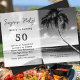 Escena de la playa de tono sepia invitación sorpresa para su celebración de un hito. Un barco de madera se encuentra en una playa desierta con palmeras, olas oceánicas y el cielo como telón de fondo para la redacción personalizado. Usa el título de fiesta sorpresa, o cámbialo por "Fiesta de Cumpleaños" o lo que sea. La edad está en grandes números y la plantilla de nombre puede dar cabida al nombre o al nombre completo. Incluir rsvp y otra información a la derecha del texto principal. Reverso es marrón sepia oscura.