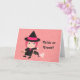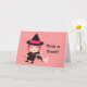 Truco o invitación con la bruja linda, feliz del chica para Halloween. La bruja del chica está en el equipo negro y rosado, sonriendo feliz mientras que ella monta la escoba que vuela. El gato negro sin embargo no disfruta del paseo tanto. Un diseño adorable y femenino para Halloween.