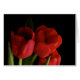 Esta tarjeta de nota magnífica ofrece un ramo de tulipanes rojos del escarlata y de hojas del verde fijados en un fondo negro puro.