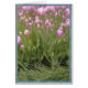 Fotografía en color de tulipanes rosas y hierba. 5"x7" (retrato). Digitalmente alterado. Borde azul.