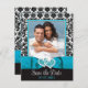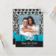 Si has encontrado el amor de tu vida y quieres invitar a toda tu familia y amigos a presenciar la unión de tus dos vidas y corazones, entonces esta encantadora boda de plantillas de fotos salva la tarjeta de fecha en damasco blanco y negro con corazones unidos sobre una verde azulada o turquesa cinta azul e imagen de arco corriendo por el fondo es una gran manera de anunciar tus próximos nupcias. El lado frontal tiene un patrón de fondo de damasco blanco y negro alrededor de la foto de compromiso sobre la cinta enmarcada en turquesa, negro y blanco. Las palabras "Save the Date" (Guardar la fecha) y la fecha de boda se imprimen debajo de la cinta sobre un fondo negro en blanco y azul turquesa. La parte posterior tiene el mismo diseño que la parte delantera con los detalles de su boda impresos en un área de texto blanco de color turquesa y negro. También se incluyen el texto del sitio web del boda y un código QR que se canjea por usted mismo si tiene un sitio web boda al que desea que la gente visite a través de un código QR. Si necesitas ayuda o quieres que un imán guarde la fecha, por favor envía tu solicitud a niteowlstudio@gmail.com o usa la función de chat Zazzle para ponerte en contacto.