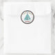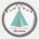 Pegatina de cumpleaños temática de camping con un ilustracion de un tipi turquesa y un bunting. El fondo es de madera. Personalice el texto. Busque invitaciones coincidentes en Jill's Paperie.