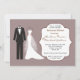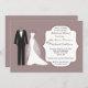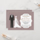 Esta invitación moderna incluye el esmoquin negro del novio y el vestido boda de la novia blanca sobre un fondo rojo medio débil (ciruela rosada). Puede utilizar esta invitación para invitaciones de bodas, invitaciones a fiestas de compromiso, guardar la fecha, la cena de ensayo o las invitaciones a almuerzos bodas. A continuación se muestra el mensaje correspondiente: