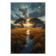 A stunning poster featuring two majestic, twisted trees standing across a golden meadow at sunset. A reflective stream leads the eye toward the glowing horizon, creating depth, calm, and cinematic atmosphere. The dramatic clouds, warm light, and fantasy-realism style make this artwork perfect for living rooms, bedrooms, studios, or meditation spaces. A powerful decorative piece that brings serenity and visual impact to any wall. A creation by ZR21Designs.