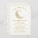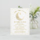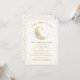 Twinkle, Twinkle, Pequeña Estrella. Cómo nos preguntamos qué eres. Esta elegante invitación a la ducha de bebé tiene un hombre celestial en la luna mirando a una pequeña estrella. Borde con estrellas de oro diminutas. NO es un Relieve metalizado real. Coincidiendo con estrellas de oro diminutas.