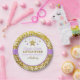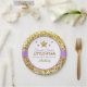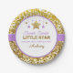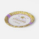 "Twinkle twinkle pequeño estrella de un año es lo que eres (nombre)" es lo que estos platos de oro y púrpura de primer cumpleaños dicen. También puedes usar estos platos para las duchas de bebé cambiando el dicho por "Twinkle twinkle little star, you know how you are (name.)" Estos platos están acentuados en morado y tienen un fondo dorado brillante con estrellas de oro y morado en la parte superior.