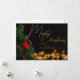 Esta magnífica tarjeta navideña no fotográfica de Feliz Navidad presenta un guión de oro moderno sobre luces brillantes al lado de un árbol navideño festivo que está decorado con ornamentos rojos y verdes. Personalizar estas elegantes tarjetas de vacaciones para tus amigos y familia en el cielo negro de la noche.