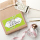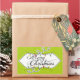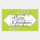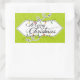 Twinkling Lights Merry Christmas pegatina con un fondo de diseño giratorio verde y un cartel blanco con texto que lee Feliz Navidad y algunas cuerdas decorativas de luces de colores. Este pegatina festivo coincide perfectamente con las tarjetas de fotos de vacaciones, franqueo y etiquetas de dirección de retorno con nuestro diseño Twinkling Lights.