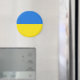 La bandera de Ucrania ha sido cuidadosamente ajustada a la forma circular de este imán. Una manera decorativa de promover la cultura ucraniana.
