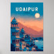 Diseño de viaje de vector retro de Udaipur. Udaipur, a menudo llamada la Ciudad de los Lagos, es un destino romántico y regional en Rajastán conocido por sus majestuosos palacios, tranquilos lagos y pintorescas vistas de las montañas.