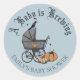 Personalizado "A Baby is Brewing" pegatina de Baby Shower de Halloween, con carruaje de bebé dibujado a mano, cuerdas y calabazas en un fondo azul francés. Ideal para decorar bolsos, cajas y sobres. Simplemente haga clic en "Personalizar esta plantilla" para insertar su propio nombre.