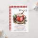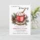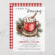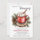 Un bebé está preparando una simple invitación Baby Shower - con chocolate caliente a color de agua con malvaviscos sentados en madera rodeado de pino natural, piñones y bayas. El fondo de la invitación es de diseño, rojo y blanco. Nuestra plantilla de Baby Shower te permite personalizar tu Invitación especial a Baby Shower.