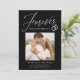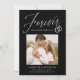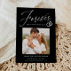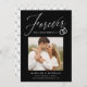 ¡Comparte la noticia de tu compromiso con estas elegantes invitaciones de compromiso fotográfico! Las invitaciones incluyen la frase "Forever tiene un bonito anillo" en un guión de caligrafía blanca acentuado por un ilustracion de anillos bodas sobre un fondo negro. Su foto cuadrada se muestra cerca del centro del diseño con sus nombres y detalles adicionales que se muestran a continuación. La invitación de compromiso moderna se invierte para mostrar un diseño geométrico blanco y negro.