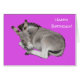 Pequeño y gris hoyo de burro cocido, echado sobre un fondo morado. El texto dice '¡Feliz cumpleaños!' en la parte delantera y en el interior '¡Que todos tus deseos de cumpleaños sean burros!'. Todo el texto se puede cambiar a palabras de su elección.