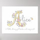 Hermoso cartel con nombre artístico de monograma perfecto para el dormitorio o sala de juegos de una niña en tonos de gris, blanco, amarillo, rosa y púrpura. Personalice con el nombre de su hijo que comience con A, y el significado del nombre para un toque verdaderamente personalizado en el dormitorio o guardería de su hijo, este ejemplo es para el nombre A Alice Noble, fuerte pero tierno y dulce. Impresión de cartel lindo ideal para un regalo de bebé nuevo, bautizo o baby shower. © Diseño de descripción y arte gráfico de monograma de corazones y flores único por Sarah Trett. www.sarahtrett.com para www.mylittleeden.com